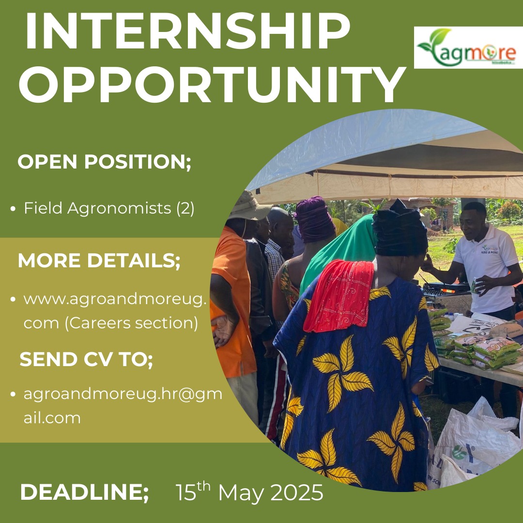 Submit a copy of your application to; agroandmoreug.hr@gmail.com. by 15th May 2025. Your application should include Curriculum Vitae, copy of Academic documents and a copy of your National Identification card as one pdf document.
